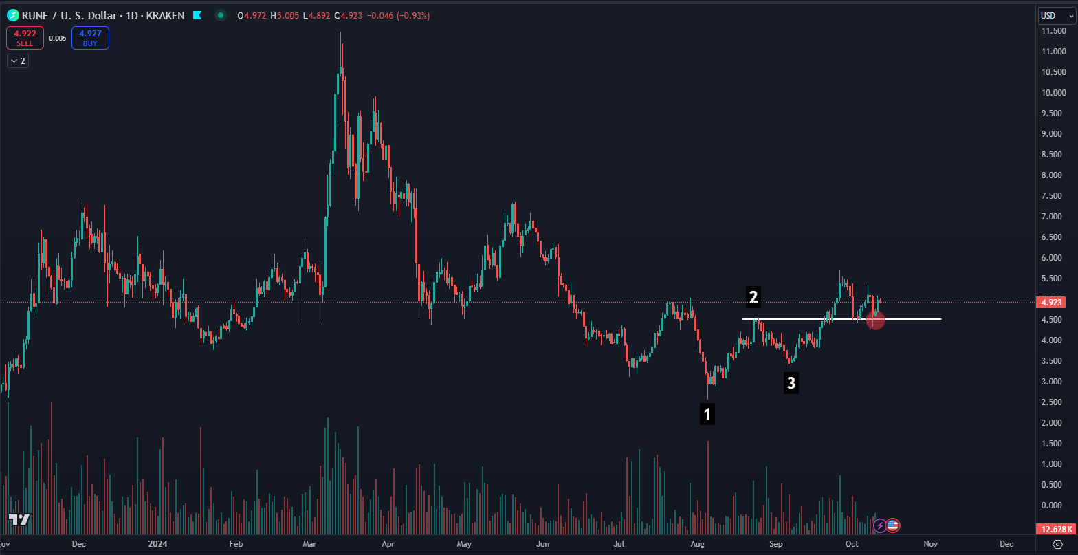 Token RUNE zaznamenal za posledných 70 dní zhodnotenie o 90 % a stále vytvára rastúce minimá a maximá. Po hlbokej korekcii nastal obrat trendu a cena sformovala reverzný vzor 123 bottom formation a následne ho otestovala (červený kruh). Tento signál naznačuje budúci rastúci trend.