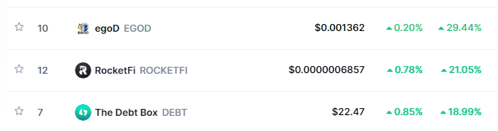 Veľmi dobrý prehľad novo vydaných projektov nám ponúka portál CoinMarketCap. V čase písania tohto článku vykazoval najlepšie výsledky token EgoD. Tento token má veľmi zaujímavú hyper deflačnú vlastnosť. Hodleri tohto tokenu majú garantované lákavé odmeny. Hodnota tokenu by mala v budúcnosti rásť, nakoľko projekt aktívne pracuje na znižovaní ponuky prostredníctvom automatického spaľovacieho mechanizmu.