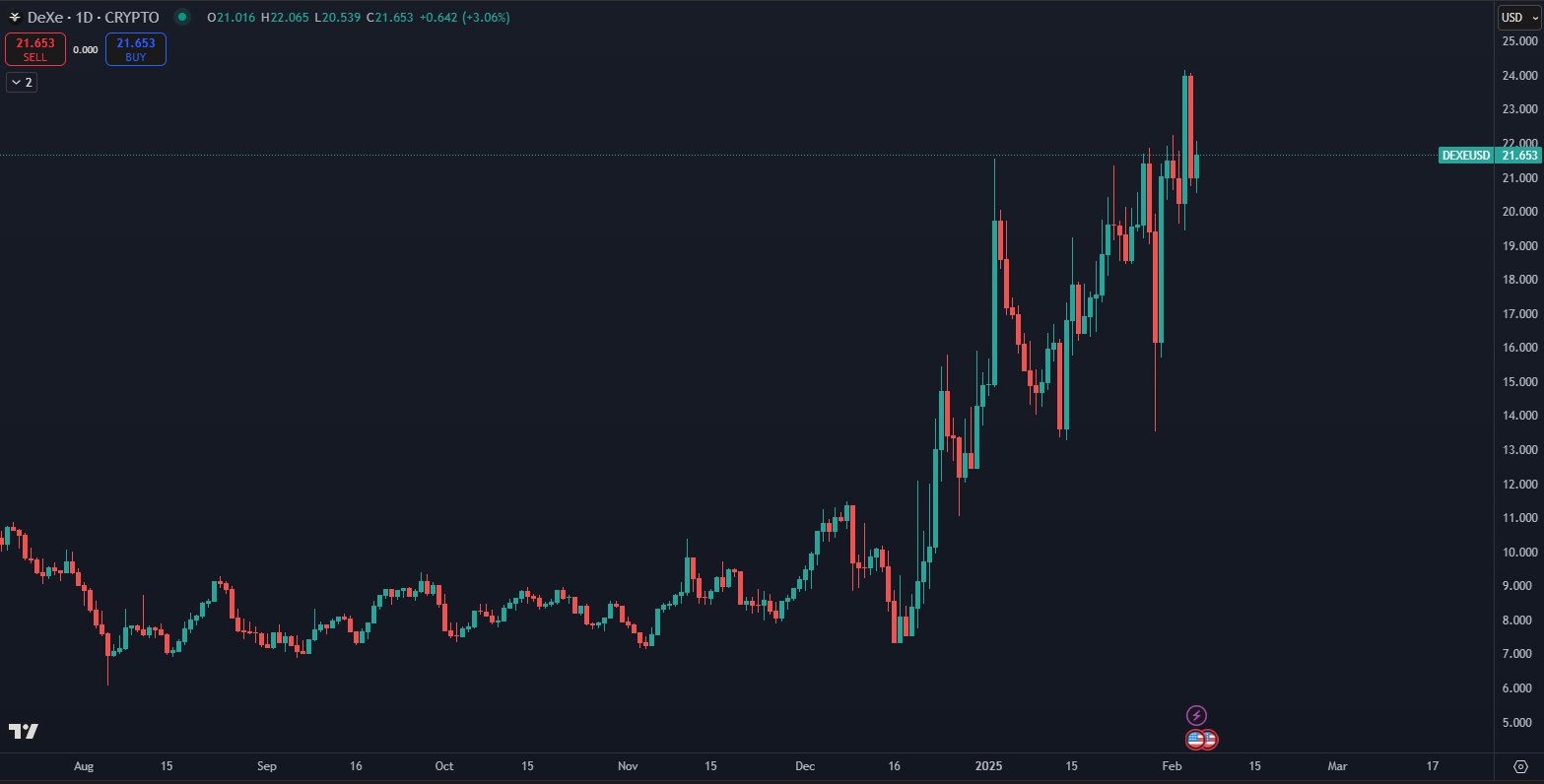 DEXE je 54. najväčšia kryptomena na svete. Podľa údajov CoinMarketCap dosahuje trhovú kapitalizáciu 1,80 miliardy dolárov. Denný objem obchodovania predstavuje 1,26 % z kapitalizácie na úrovni 22,76 milióna dolárov.