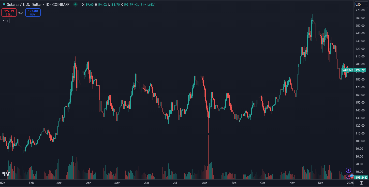 Solana sa v čase písania obchoduje na trhovej cene 192 dolárov a má za sebou za posledný mesiac výraznú korekciu. Napriek tomu je trend z dlhodobého hľadiska rastúci a vykazuje stúpajúce minimá. Solana dokázala stúpnuť za posledný rok o 90 %.