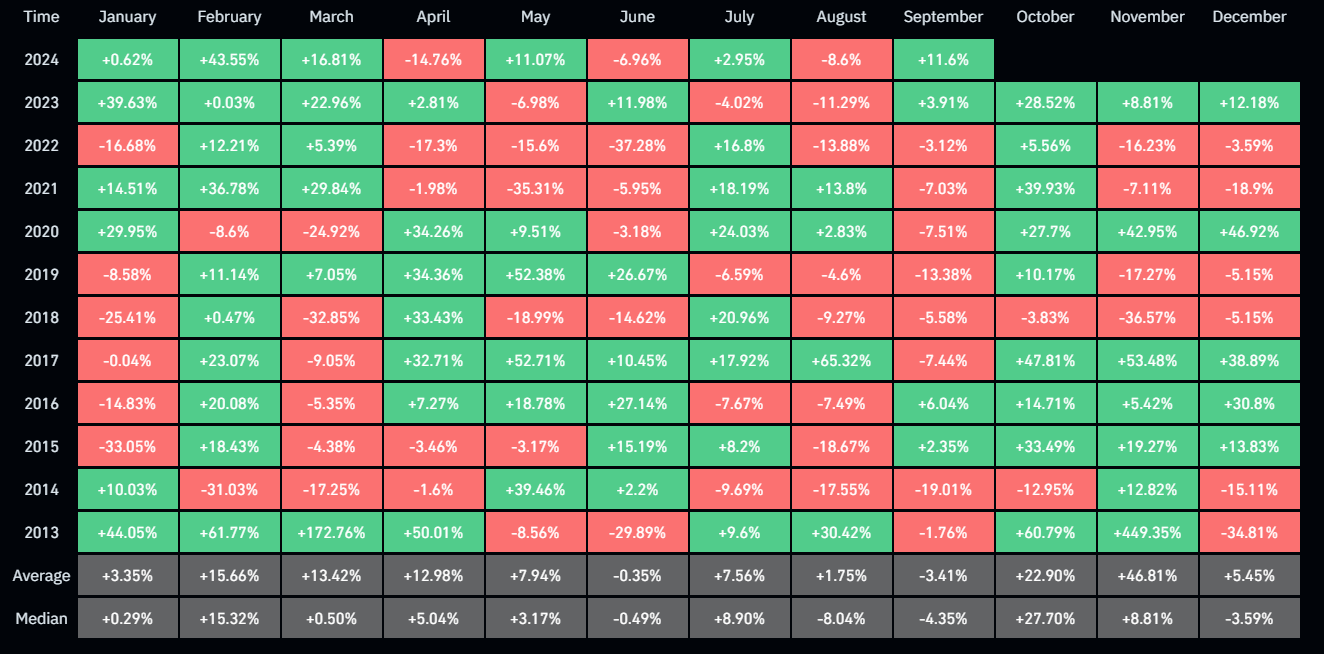 Podľa údajov Coinglass sú október a november najziskovejšie mesiace pre Bitcoin a kryptomeny. Október uzavrela najväčšia kryptomena na svete v priemere v zisku 22,90 % za poslednú dekádu. Ak sa bude história opakovať, zrejme by sa investori mali pripraviť na inkasovanie ziskov.