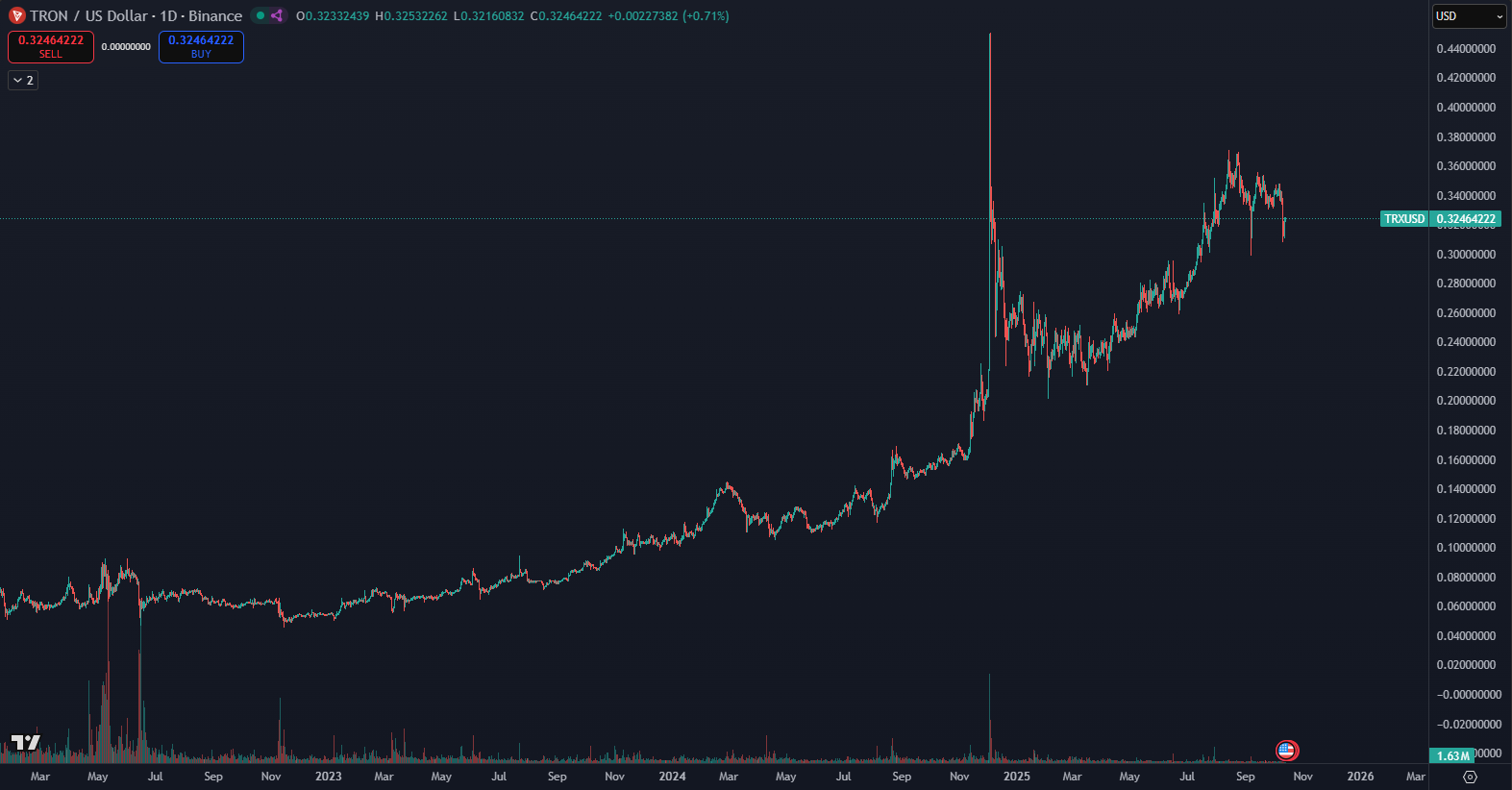 TRX ukázal odolnosť počas nedávnej korekcie trhu, pričom jeho cena padla za počas čierneho piatku 10. októbra len o 9 %. To potvrdzuje dôveru komunity a rastúci záujem inštitucionálnych investorov.