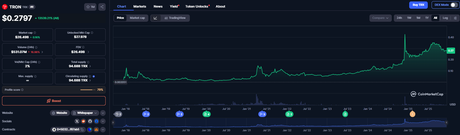 Cena kryptomeny Tron. Zdroj: coinmarketcap.com