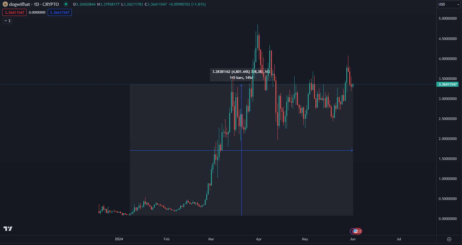 Druhou kryptomenou v zozname je Dogwifhat (WIF), ktorý dokázal stúpnuť za posledných 145 dní až o 4 800 %. Cena stúpla po tom, čo Dogwifhat Store potvrdil, že akceptuje Solana Pay, pričom sľúbil, že všetky zisky dá na charitu. Takéto fundamentálne správy sú však v prípade meme coinov ojedinelé a hýbu s cenou iba krátkodobo.