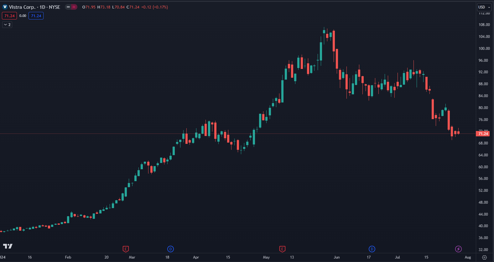 Spoločnosť Vistra (VST) sa stala obľúbenou skrytou AI akciou investorov po tom, čo spoločnosť 1. marca dokončila akvizíciu prevádzkovateľa jadrovej flotily Energy Harbor so sídlom v Ohiu. Akcie tak zaznamenali v roku 2024 zisk až 84,63 %, no posledné 2 mesiace neustále klesajú.