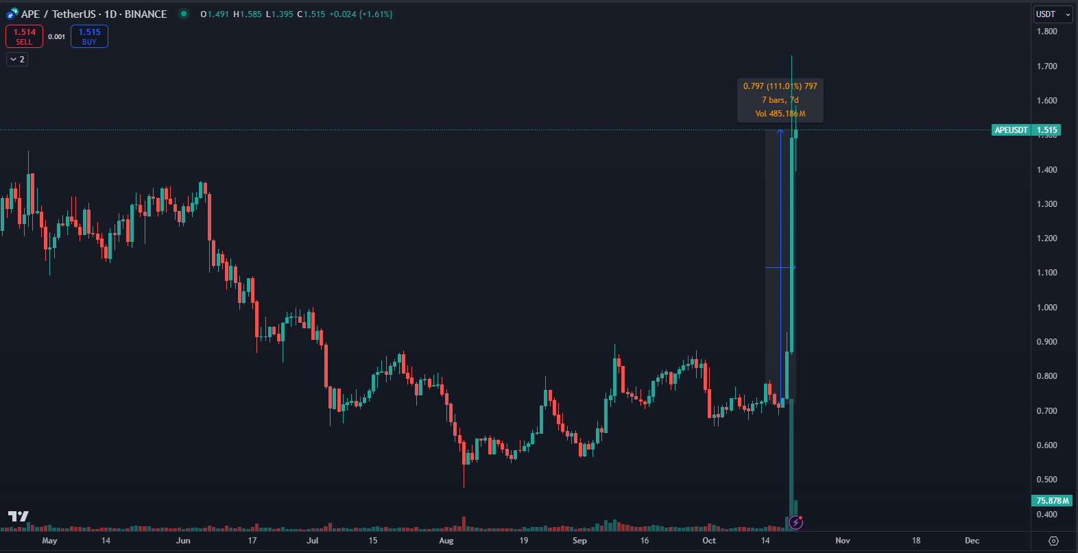 APE je 67. najväčšia kryptomena na svete. Podľa údajov CoinMarketCap dosahuje trhovú kapitalizáciu 1,14 miliardy dolárov. Denný objem obchodovania predstavuje 140,44 % z kapitalizácie na úrovni 1,59 miliardy dolárov.