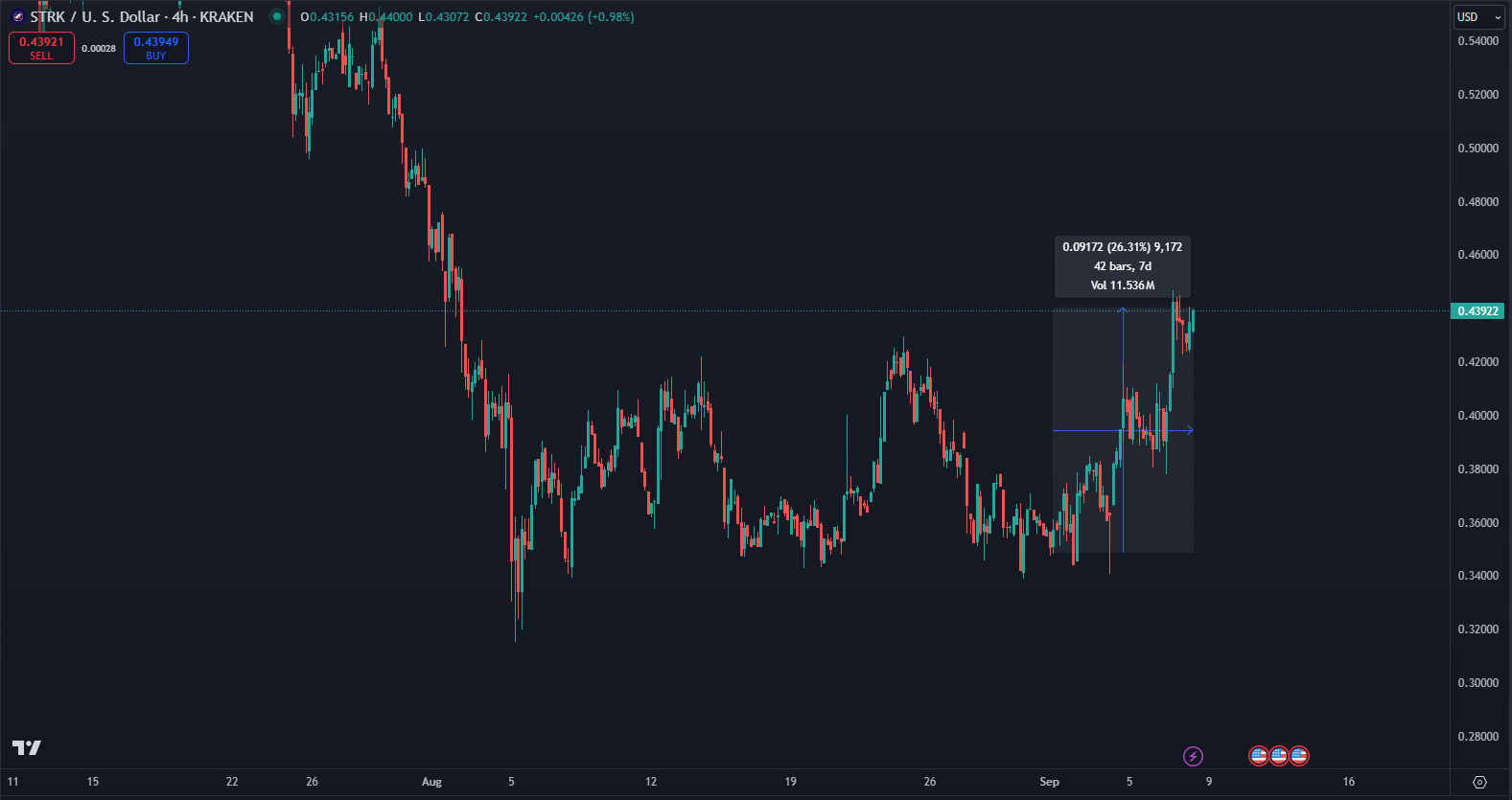 Token STRK stúpol za posledných 7 dní o 26,31 % a ide o najziskovejšiu kryptomenu spomedzi rebríčka top 100. Na rozdiel od SUI a UNI, cena drží rovnakú úroveň podpory už vyše mesiaca, čo naznačuje potenciálne dno. Zrejme ešte istý čas potrvá, kým začne dlhodobý rastúci trend, no podobné správanie naznačuje, že cena je buď na dne, alebo v jeho blízkosti.