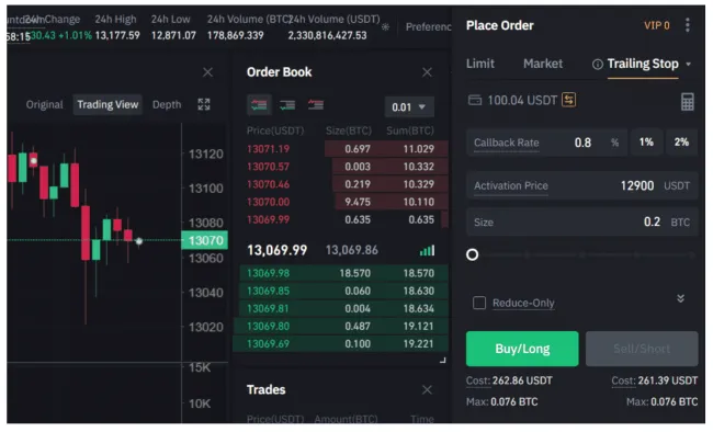 Vo vyššie uvedenom príklade má tento trailing stop nákupu (long) aktivačnú cenu 12,900 dolárov. Zatiaľ čo teda trh naďalej obchoduje nad touto úrovňou, táto objednávka zostáva nečinná.