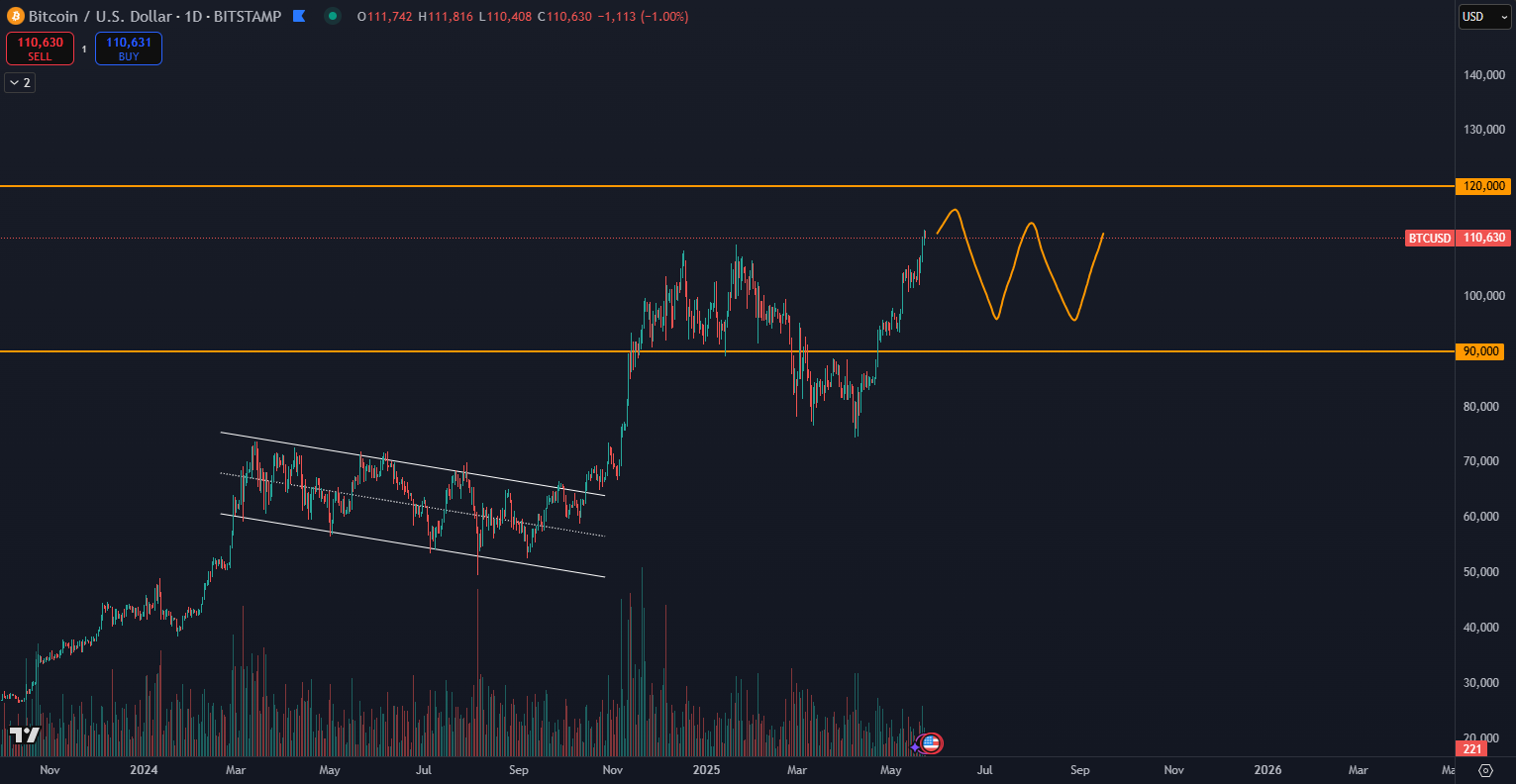 Tento realistický scenár predpokladá, že po prudkom náraste na nové maximum dôjde ku konsolidácii. Cena by sa mohla ustáliť v pásme medzi 90 000 až 120 000 dolárov počas nasledujúcich mesiacov. Tento vývoj by zohľadňoval: