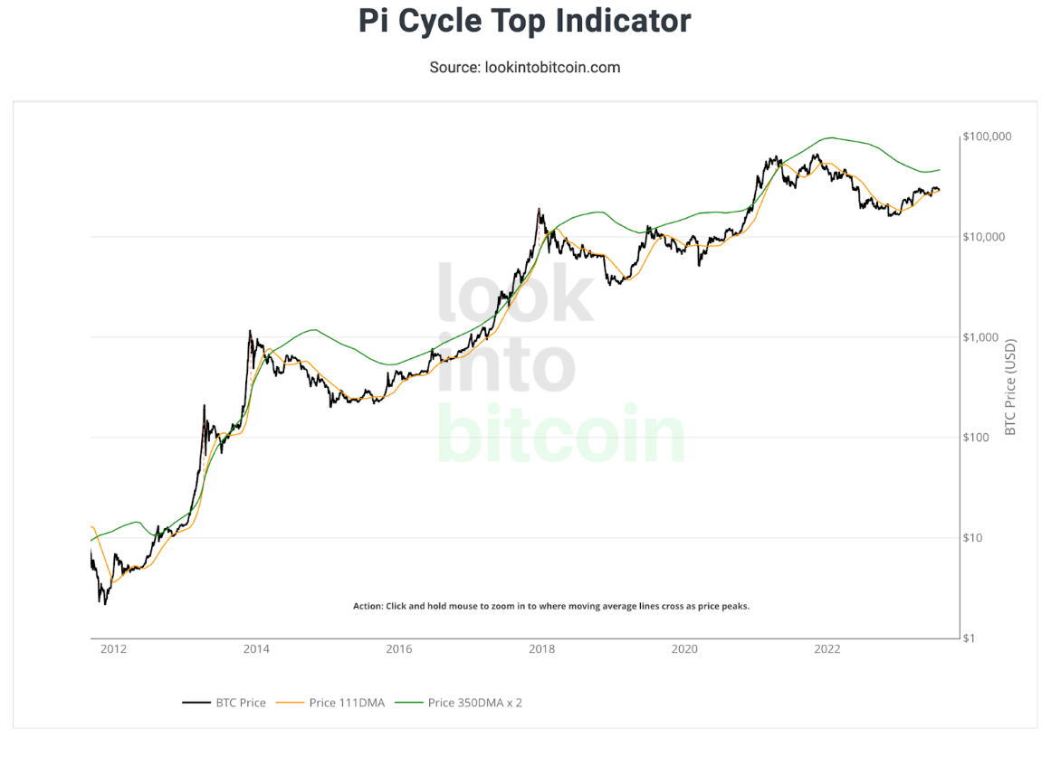 Pi Cycle Top indikátor používa 111-dňový kĺzavý priemer (111DMA) a násobok 350-dňového kĺzavého priemeru (350DMAx2) na predpovedanie vrcholu Bitcoinu. Pi Cycle Top sa pokúša identifikovať bod maximálnej chamtivosti, ktorá naznačuje, že trh je blízko korekcie. Keď sa 111DMA posunie nahor a prekročí hranicu 350DMAx2, je to silný indikátor toho, že Bitcoin je na vrchole alebo blízko neho.