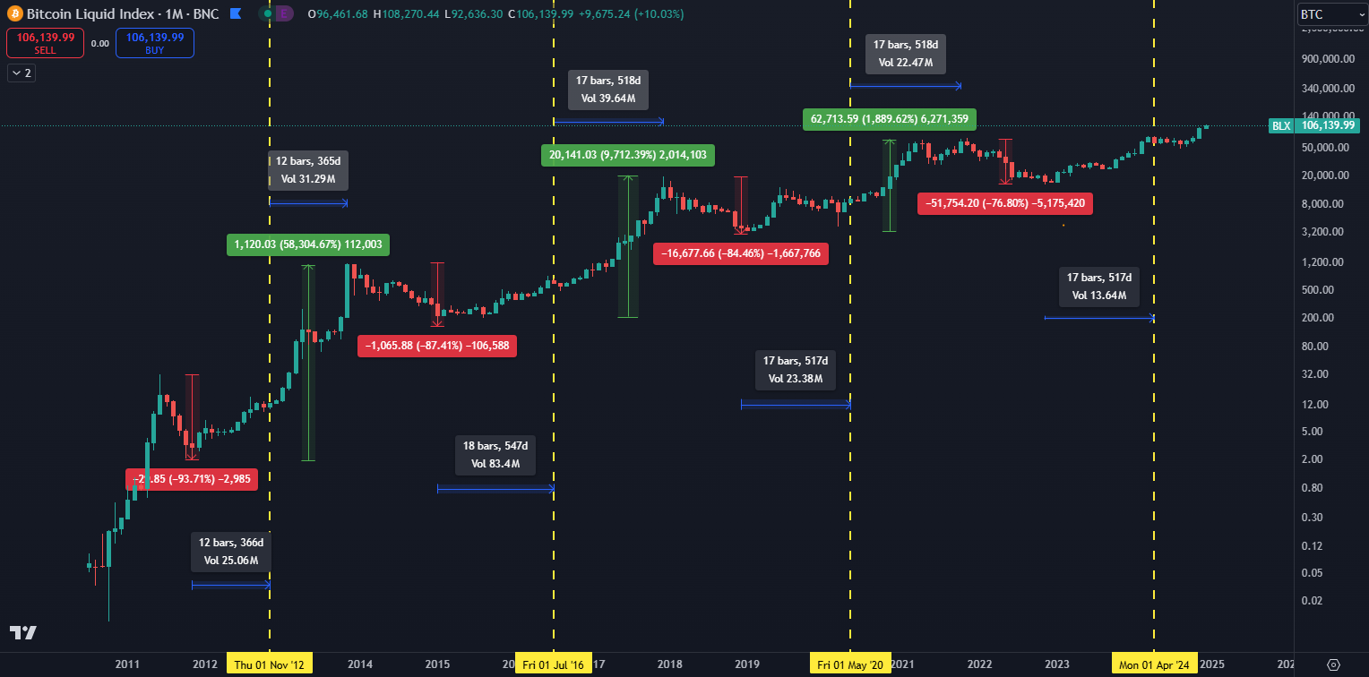 Bitcoinový index a dlhodobé cykly. Zdroj: TradingView