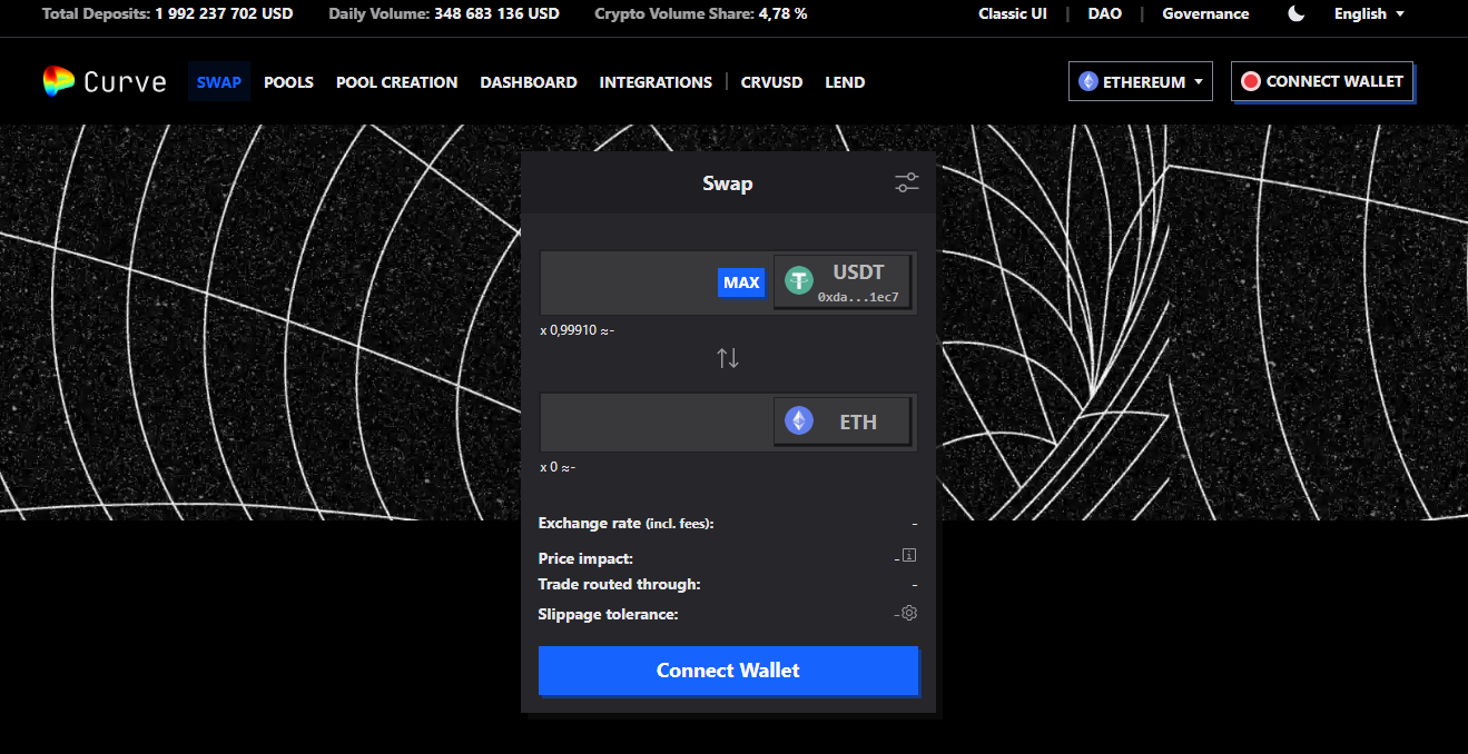 Decentralizovaná burza Curve má v čase písania denný objem obchodovania na úrovni 318 miliónov dolárov. Burza dosahuje trhový podiel na úrovni 4,90 % a poskytuje obchodovanie so 153 kryptomenami a 348 pármi.