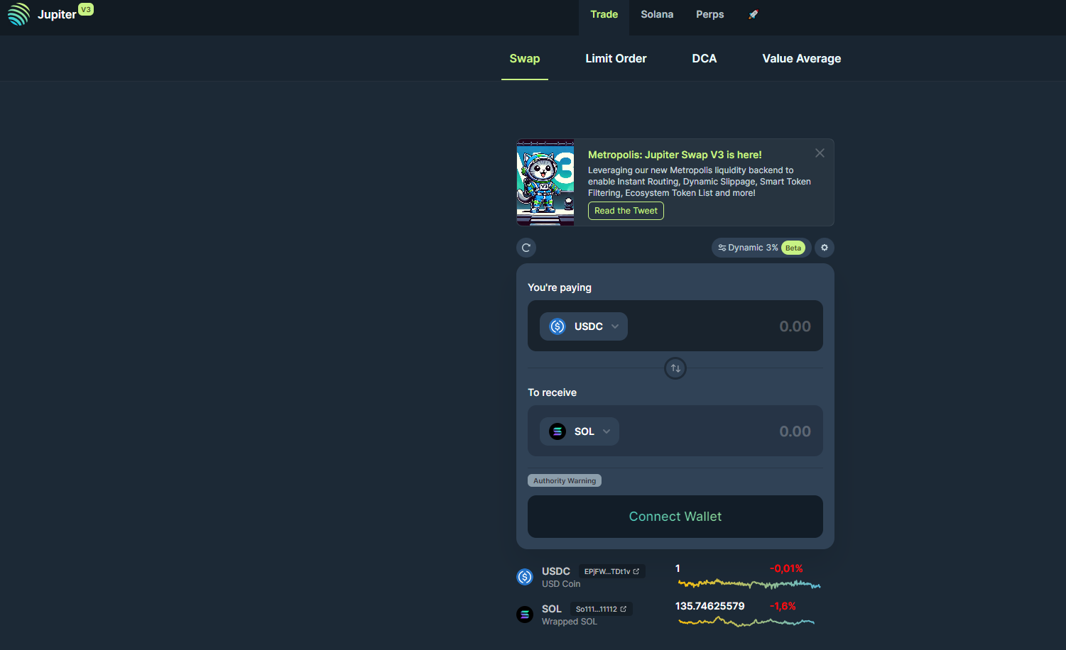 Ako agregátor likvidity na Solane Jupiter agreguje najlepšie ceny tokenov na rôznych decentralizovaných burzách spojením všetkých DEX trhov (bez ohľadu na poskytovateľa). To umožňuje odhaliť cenovú neefektívnosť a volatilitu na trhoch. Medzi ďalšie kľúčové funkcie patrí automatické zalistovanie nových tokenov hneď po ich spustení na Solane.