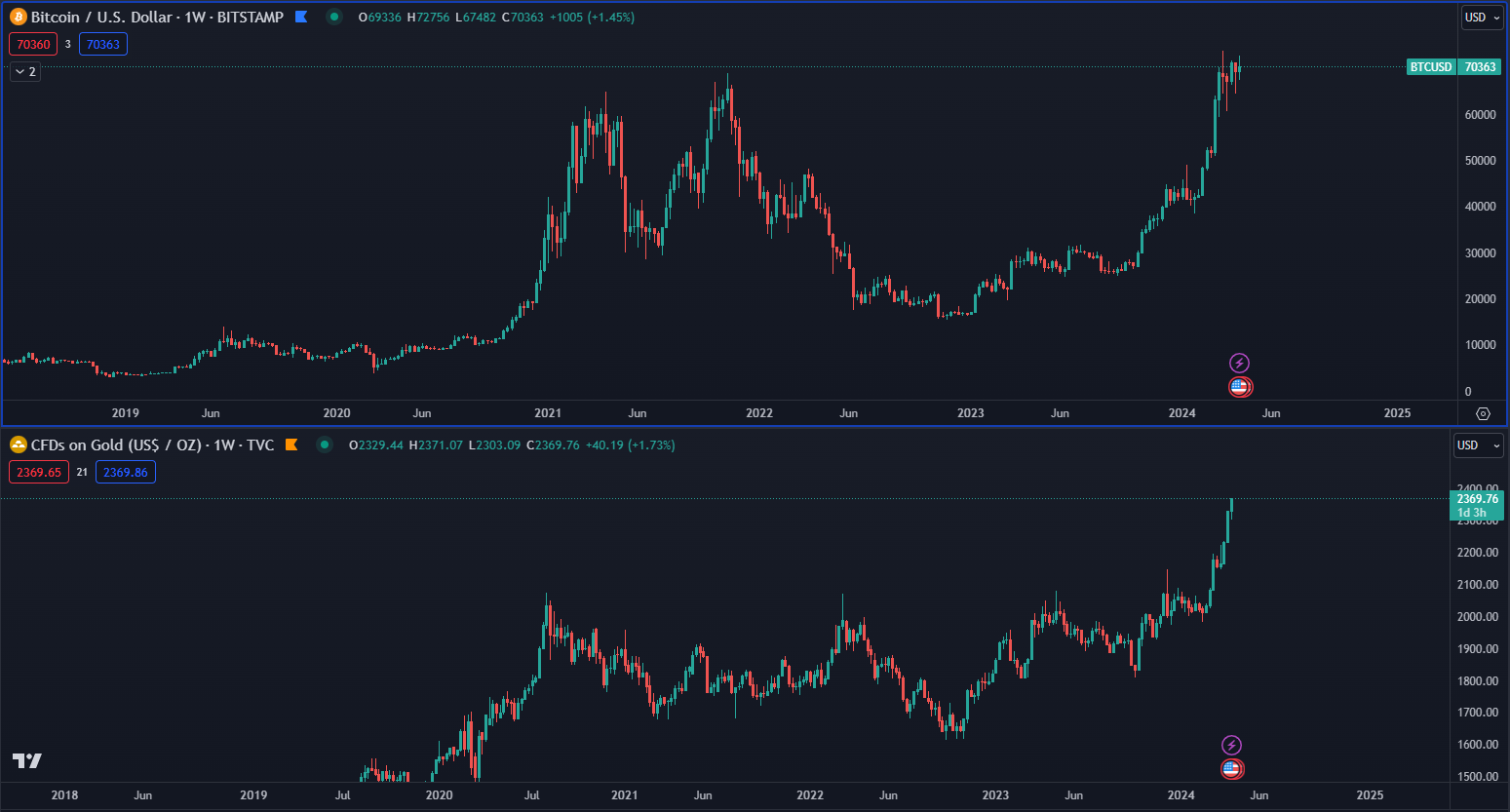 Hovoríme predovšetkým o aktívach, ktoré od svojho vzniku fungujú ako zaistenie voči inflácii a uchovávajú hodnotu. Z dlhodobého hľadiska je preferované nakupovanie zlata, ale do popredia sa v poslednom desaťročí dostal aj Bitcoin. Obe aktíva spája obmedzená ponuka, avšak cenová volatilita je neporovnateľná. Zlato aj Bitcoin navyše nedávno prekonali historické maximá.