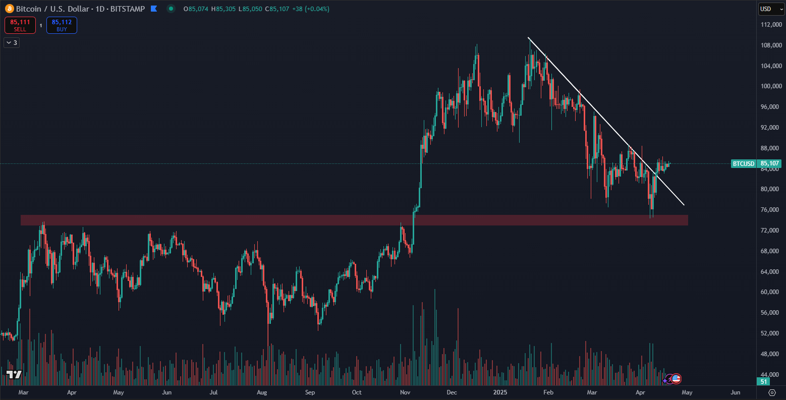 V prvom aprílovom týždni 2025 Bitcoin otestoval predchádzajúce historické maximum z roku 2024, čím vyslal pozitívny technický signál. Zároveň sa začína meniť charakter korekcie – hoci minimá stále klesajú, tempo poklesu sa viditeľne spomaľuje.