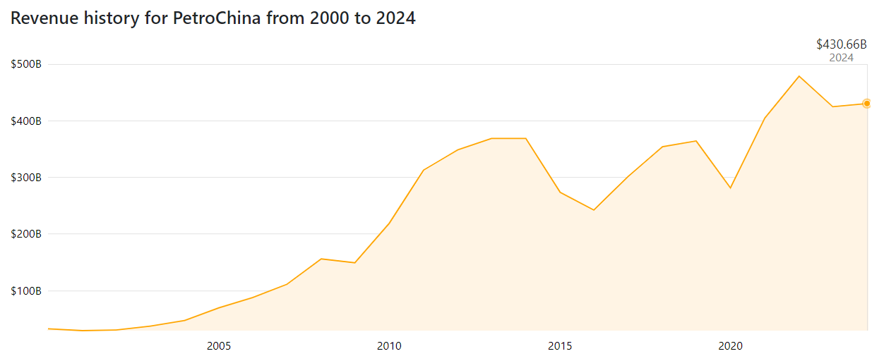 Súčasné príjmy spoločnosti PetroChina za rok 2024 sú na úrovni 430,65 miliardy dolárov. V roku 2023 dosiahla spoločnosť príjmy vo výške 424,78 miliardy dolárov, čo predstavuje pokles oproti príjmom v roku 2022, ktoré boli 479,13 miliardy dolárov. Trhová kapitalizácia firmy dosahuje 226 miliardy dolárov, vďaka čomu ide o 54. najväčšiu spoločnosť na svete.