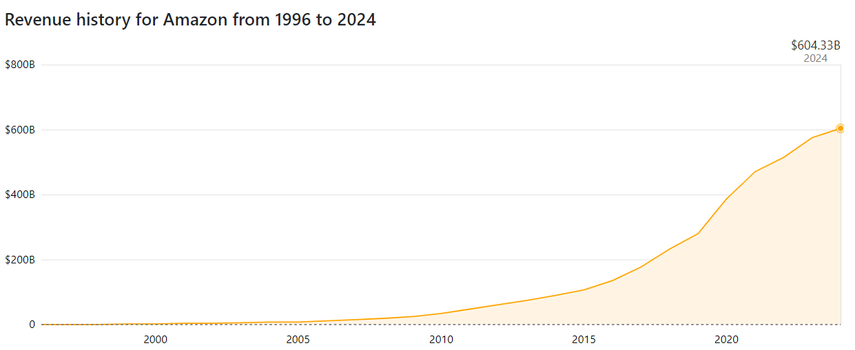 Súčasné príjmy spoločnosti Amazon za rok 2024 sú na úrovni 604,33 miliardy dolárov. V roku 2023 dosiahla spoločnosť príjmy vo výške 574,78 miliardy dolárov, čo predstavuje nárast oproti príjmom v roku 2022, ktoré boli 513,98 miliardy dolárov. Trhová kapitalizácia firmy dosahuje 1,81 bilióna dolárov, vďaka čomu ide o 5. najväčšiu spoločnosť na svete.