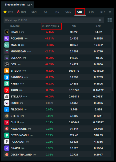 Na obrázku nižšie vidíte, že na XTB si môžete zoradiť kryptomeny podľa cenového výkyvu, vďaka čomu viete, ktorá kryptomena klesla najviac a ktorá najmenej.