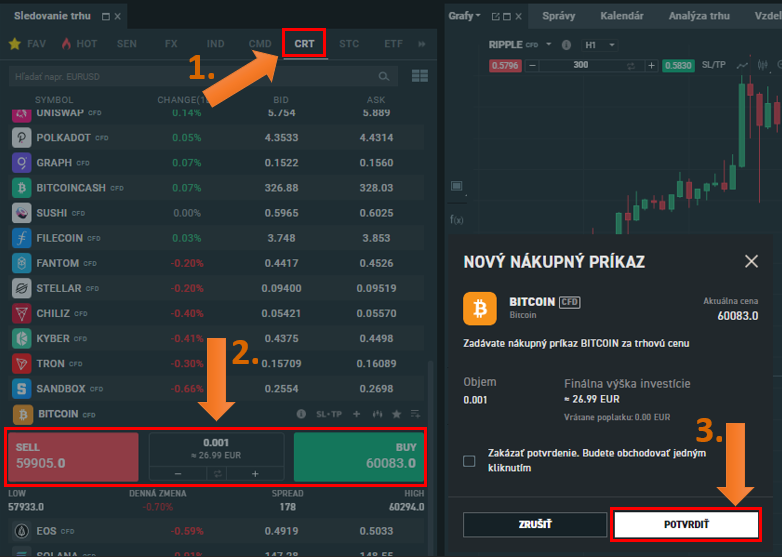 Na obrázku nižšie sa môžete pozrieť, ako nakúpite kryptomenu na XTB. A keďže ide o HODL stratégiu, nič viac vám netreba vedieť. Jednoducho nakúpite a držíte, maximálne sa rozhodnete sem tam dokúpiť. Je dôležité poznamenať, že každá kryptomena má svoju minimálnu hodnotu nákupnej objednávky. V prípade Bitcoinu je to napríklad 0,001 BTC.