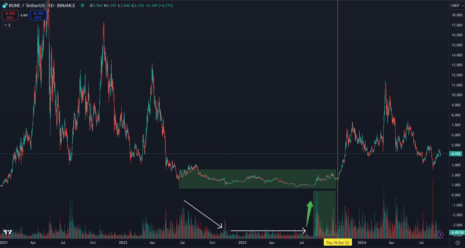 Najprv si nájdete kryptomenu, ktorej cena je už dlhé obdobie na dne a pohybuje sa bokom (zelená oblasť ceny na grafe nižšie). Táto zóna sa nazýva akumulácia. Následne hľadáte, ktorá kryptomena je v takejto fáze, a zároveň sa jej objemy sa posledné týždne rapídne zvýšili (zelená zóna na objemoch na grafe nižšie).
