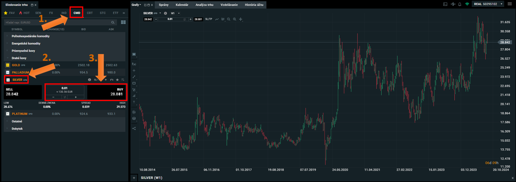 Celková svetová hodnota striebra je ovplyvňovaná aj veľkým množstvom, ktoré bolo zničené v dôsledku priemyslu – využíva sa na výrobu batérií a elektroniky (56 %), pričom zvyšok je spracovaný predovšetkým na šperky (11 %), alebo je používaný na investičné účely. Paradoxne má tak viac reálneho využitia ako zlato. Na obrázku nižšie môžete vidieť, ako nakúpiť striebro na XTB.