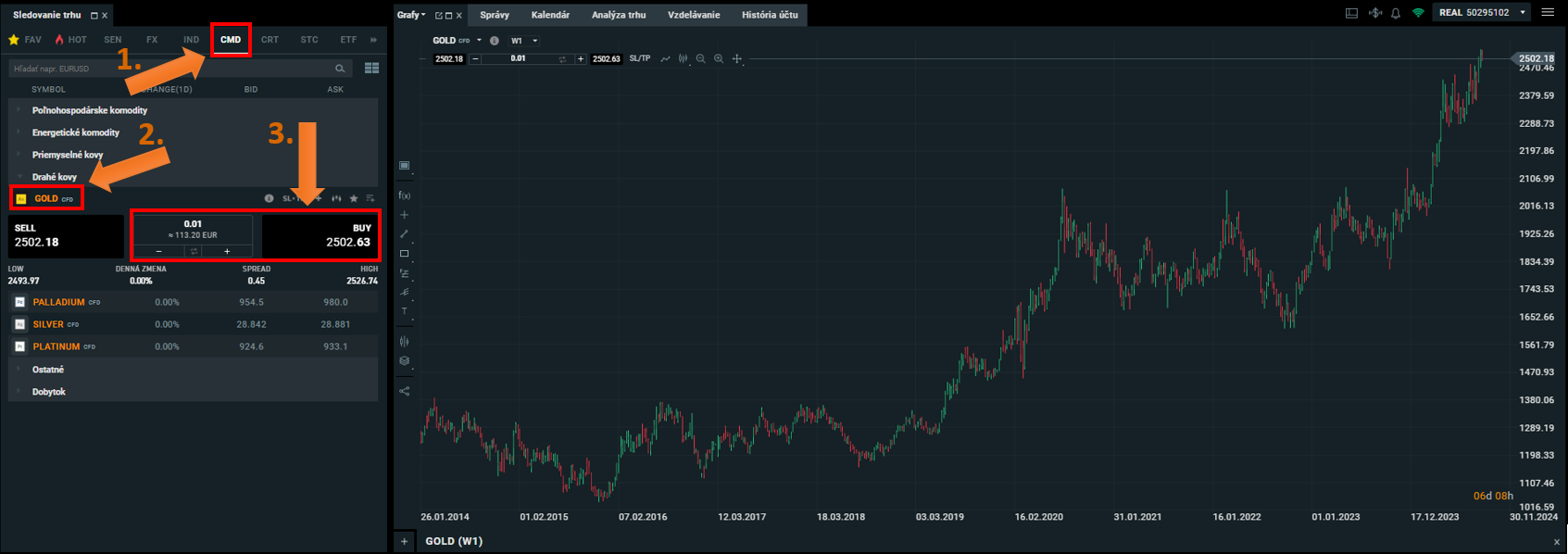 Cena zlata posledné mesiace neustále prekonáva nové historické maximum. Dokonca aj v čase písania sa zlato obchoduje na najvyššej úrovni, akú sme mohli doposiaľ vidieť. Na obrázku nižšie môžete vidieť, ako kúpiť zlato na XTB.