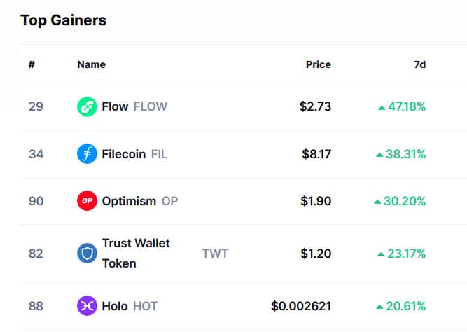 Najviac rastúcou kryptomenou posledných dní je token FLOW. Ide o decentralizovanú a rýchlu sieť, ktorá sa špecializuje na novú generáciu hier a aplikácií. Token FLOW je palivom siete a všetkých aplikácií, ktoré sú súčasťou jeho ekosystému. Kryptomena v poslednej dobe narástla o viac ako 47 % a v čase písania článku sa obchoduje FLOW za 2,73 dolára.