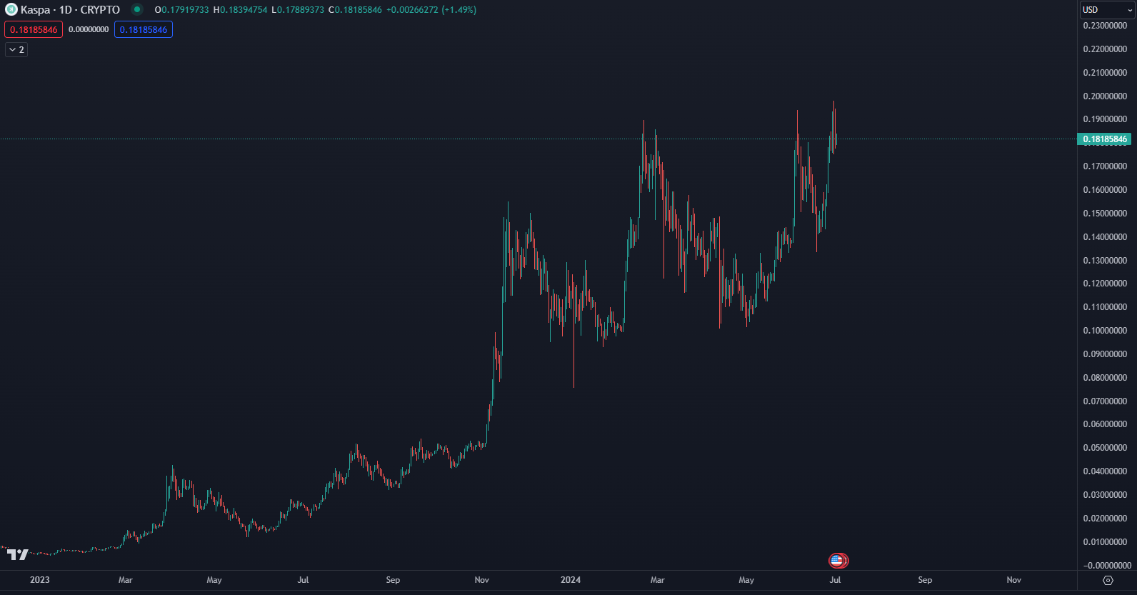 Kaspa je v súčasnosti zrejme najpopulárnejšia kryptomena v sektore ťažby. Cena tokenu Kaspa vzrástla v tomto roku o takmer 50 %. Marathon Digital (MARA), obrovská spoločnosť, ktorá ťaží Bitcoin, začala po novom ťažiť aj kryptomenu Kaspa s cieľom diverzifikovať svoje ťažobné príjmy. Vďaka tomu by rast mohol pokračovať.