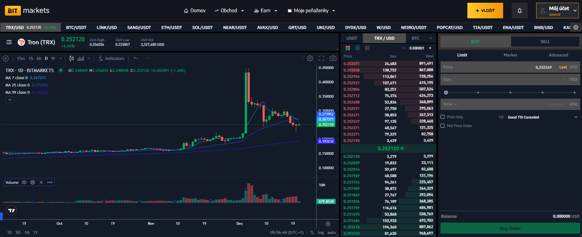 TRX sa vyznačuje neustálym rastom už vyše dvoch rokov. Tento nárast však eskaloval do exponenciály, keď cena len za jediný deň stúpla o 100 %. Obrázok nižšie zobrazuje jednoduchý nákup kryptomeny na burze BITmarkets.