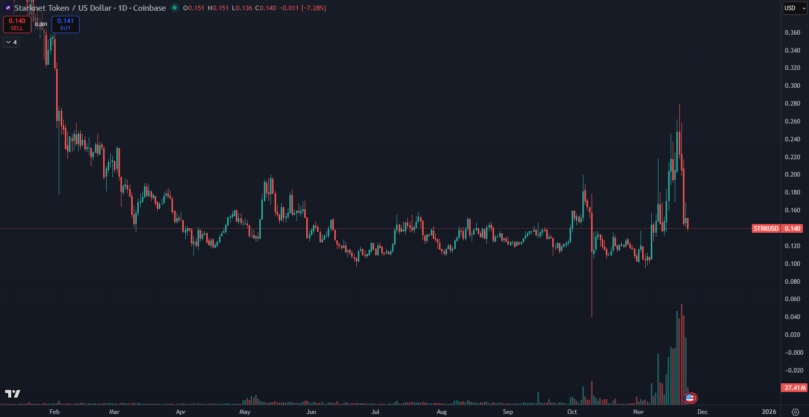 Napriek všeobecnému poklesu trhu Starknet pôsobil ako výnimka. STRK zaznamenal pozitívnu dynamiku práve v období, keď sa blížila séria tokenových odomknutí pre investorov a tím. Projekt využíva pokročilé kryptografické koncepty a ťaží z trendu ETH Layer-2 riešení.