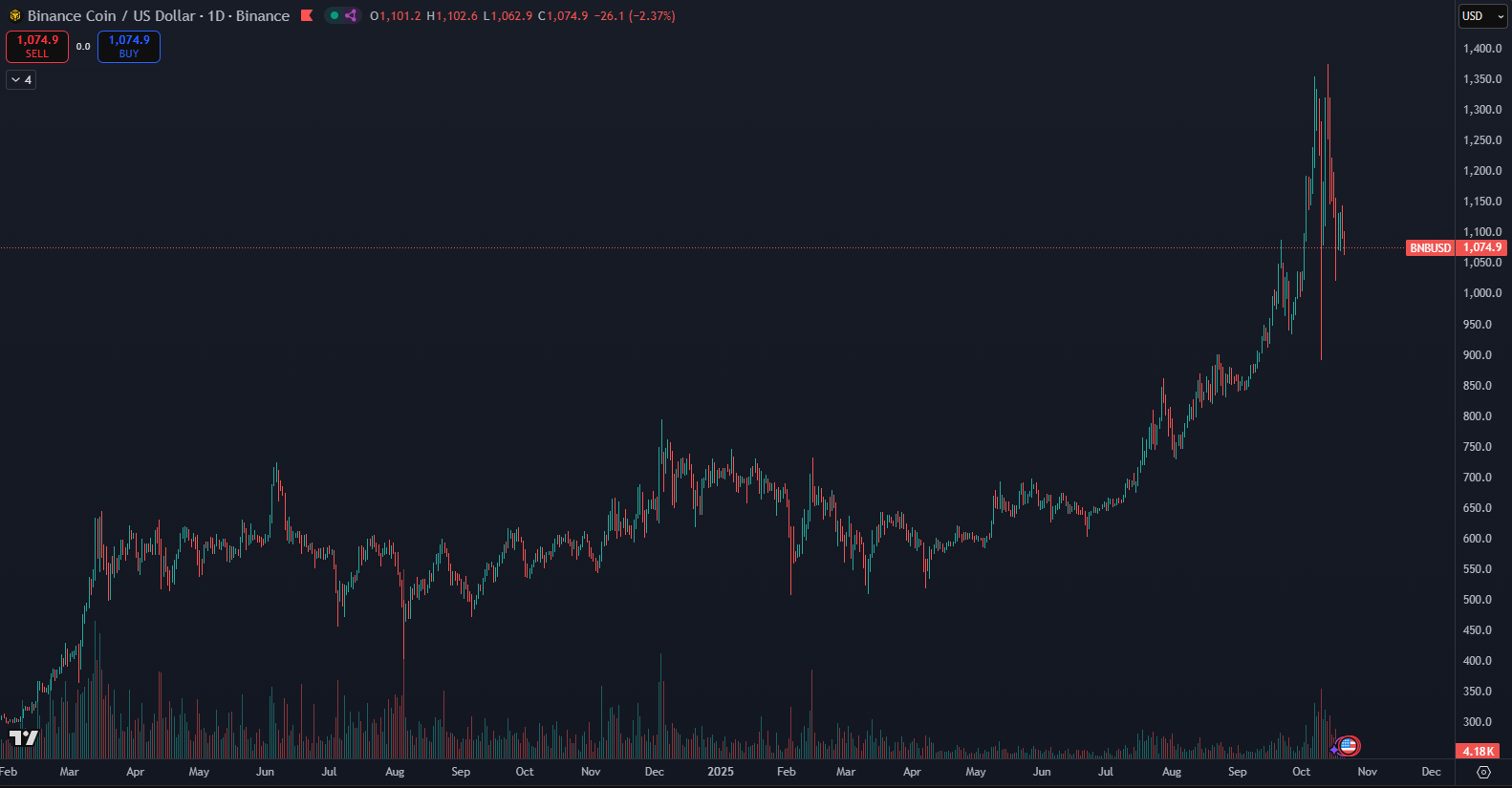 Po októbrovej korekcii sa BNB nachádza na úrovniach podpory, čo naznačuje potenciál pre obnovu. Trhová cena nedávno zaznamenala rekordný vzostup, po ktorom je korekcia prirodzená. BNB sa dokonca vyšplhal až na cenu prevyšujúcu 1 350 dolárov.