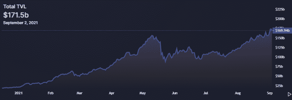 Posledná metrika, ktorá naznačuje, že prebieha prelievanie peňazí do DeFi, je celková uzamknutá hodnota (TVL) vo všetkých protokoloch. Dňa 2. septembra toto číslo dosiahlo nové rekordné maximum 171,5 miliardy dolárov.