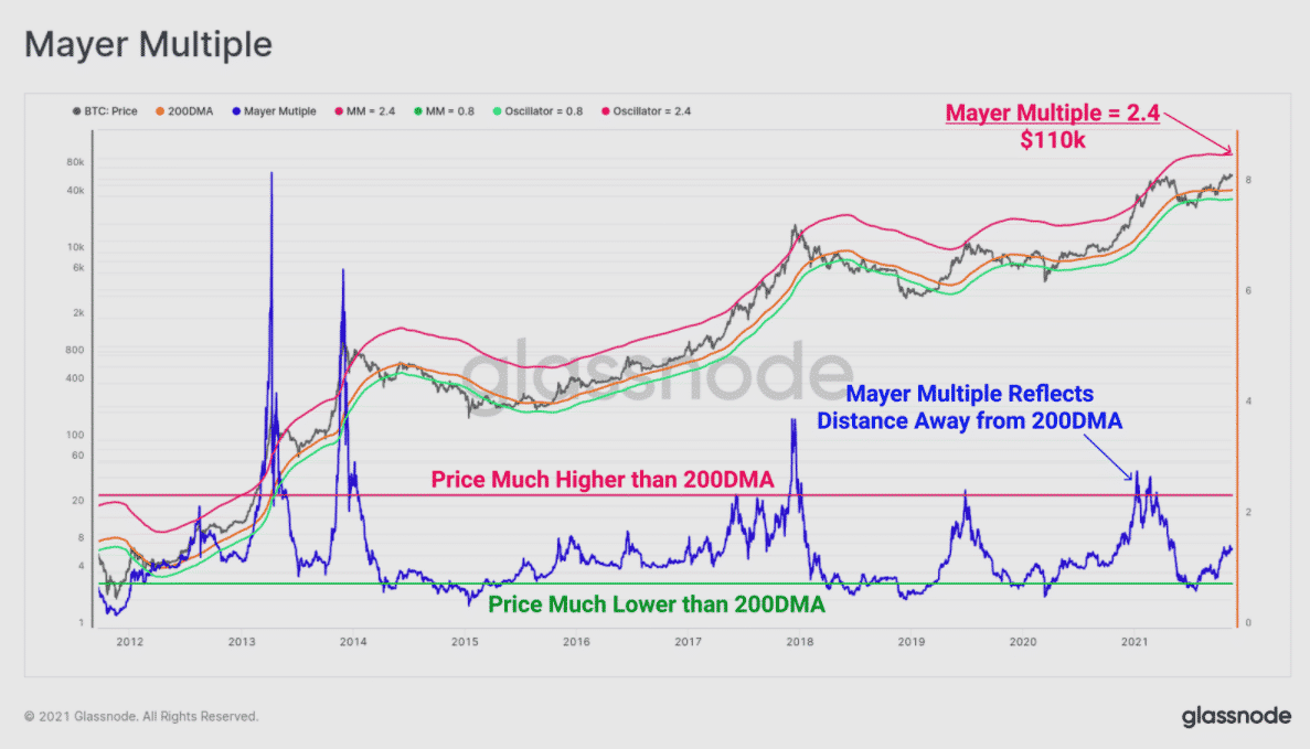 Mayer Multiple je prvým nástrojom spomenutým v správe, ktorá bola vydaná v pondelok. Popisuje sa ako „jednoduchý, ale efektívny pomer medzi cenou a 200 DMA” (200-dňový kĺzavý priemer). Mayerov násobok používa štatistické metódy na preukázanie, že hodnota 2,4 Mayerovho násobku bude odrážať nepravdepodobný extrém. V tomto scenári sa cena z dlhodobého hľadiska zvýšila 2,4-krát.