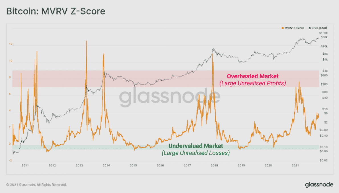 Táto metrika využíva štatistickú normalizáciu na meranie štandardných odchýlok spotovej ceny od realizovanej ceny. Správa ďalej vysvetľuje tento tretí nástroj tak, že vysoké hodnoty na trhu znamenajú, že investori naďalej držia veľké nerealizované zisky, čo naznačuje, že stimul na predaj dosiahol maximum. To by mohlo pomôcť predpovedať, kedy trh dosiahne vrchol.