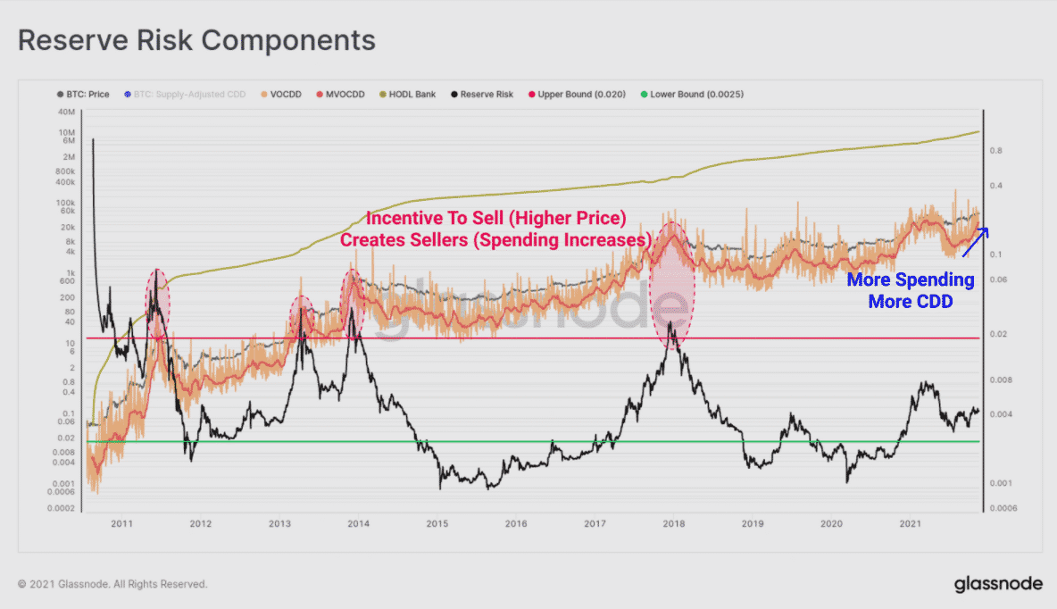 Ceny sa však časom dostanú do bodu, keď je väčšina držiteľov ochotná predať. Len čo sa to stane, náklady príležitostí budú realizované na strane investorov, čo spôsobí, že metrika rezervného rizika bude trendovať vyššie a bude dosahovať vrcholy.