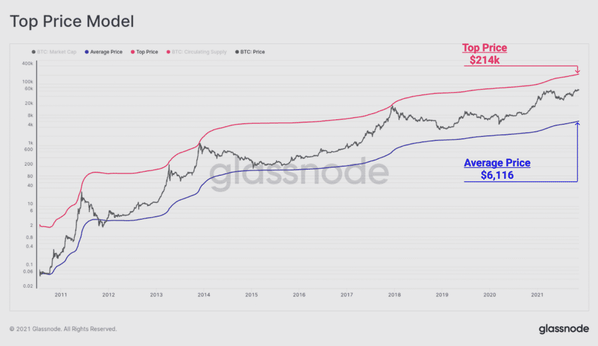 Druhým nástrojom je model najvyššej ceny. Tento nástroj bol pôvodne vytvorený analytikom Willym Woom ako prispôsobený model, ktorý násobí celkovú priemernú cenu faktorom 35. V tomto prípade je celková priemerná cena 6,1 tisíc dolárov. Vynásobením faktorom 35 by bitcoinový vrchol dosiahol 214 000 dolárov.