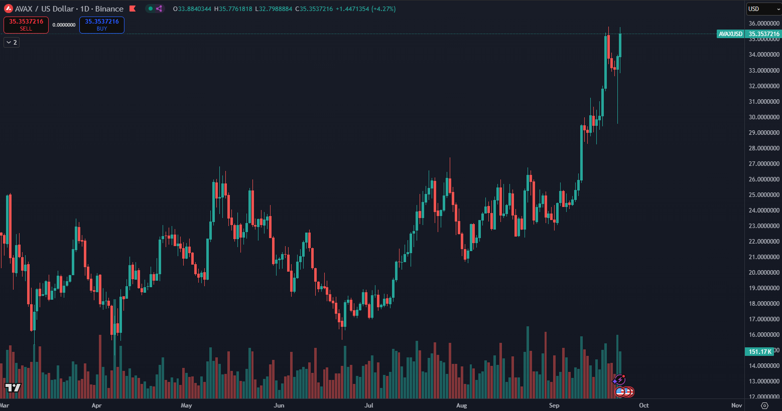 Avalanche (AVAX) napriek súčasnej korekcii kryptotrhu neustále rastie a dosiahlo tohtoročné maximá. Jeho trhová kapitalizácia činí 14,93 miliardy dolárov, čo z neho robí 12. najväčšiu kryptomenu na svete. Stabilný rast AVAX poukazuje na silný záujem investorov a odolnosť proti trhovým výkyvom.