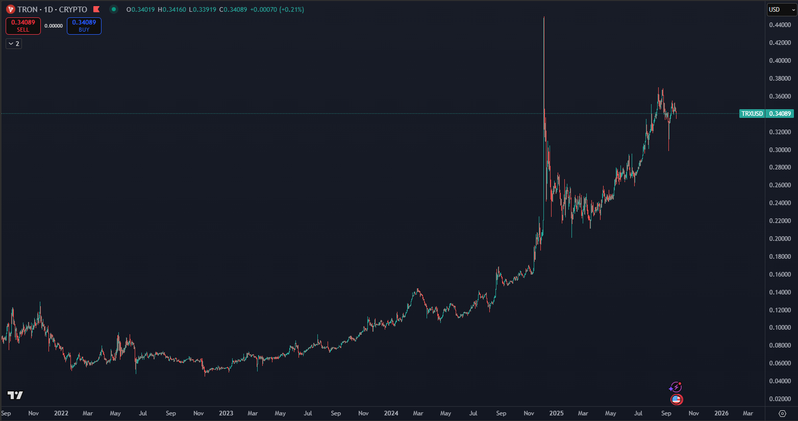 Tron rastie vďaka silnej adopcii a reálnemu využitiu, vedeniu v stablecoinových transakciách a rastúcemu inštitucionálnemu záujmu, vrátane SRM Entertainment, uviedla správa Crypto Front News. Staking prináša odmeny a podporuje dlhodobé držanie tokenov, zatiaľ čo aktívne využitie siete v digitálnom obchode zvyšuje hodnotu TRX.