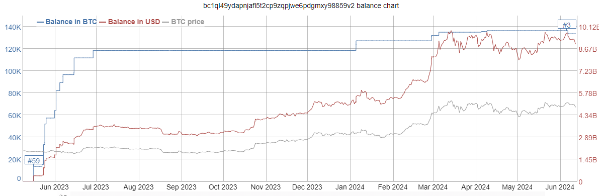 Hovorí sa, že túto peňaženku ovláda Robinhood. Hodnota tejto peňaženky bola ešte v máji 2023 na úrovni 0,19 BTC. Len dva mesiace na to sa celková držba BTC vyšplhala na 120 000 BTC. Odvtedy došlo iba ku menším skokom, no dlhodobo hodnota peňaženky stúpa. Momentálne ide o tretiu najväčšiu bitcoinovú peňaženku.