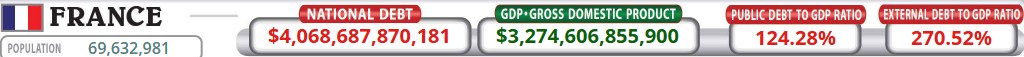 Francúzsko má verejný dlh vo výške 4,06 bilióna dolárov, čo predstavuje 124,28 % HDP. Tento vysoký pomer je výsledkom roky trvajúcej politiky silného sociálneho zabezpečenia, ktorá zahŕňa dôchodky, zdravotnú starostlivosť a verejné služby. Vlády sa len ťažko odhodlávajú ku konsolidácii verejných financií, najmä kvôli častým protestom a odporu verejnosti.