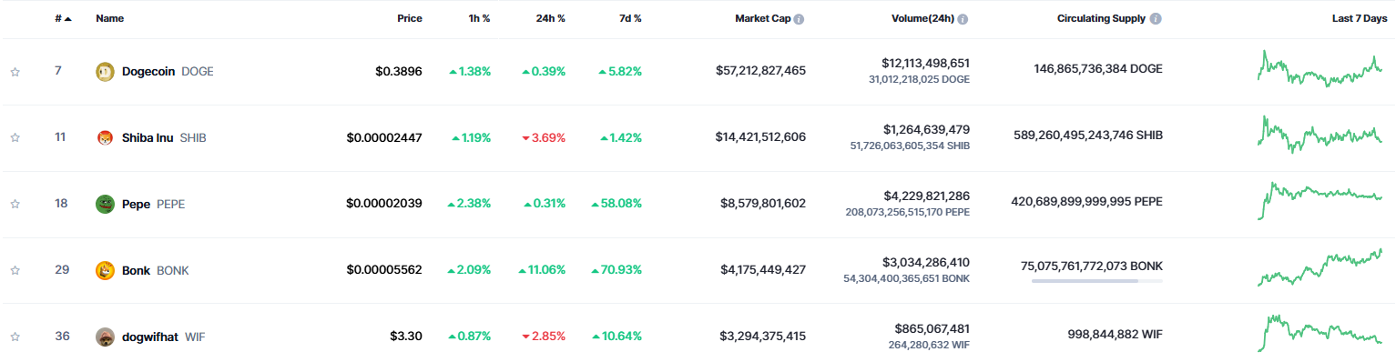 Meme coiny zažívajú svoj najväčší rozmach v histórii. Na popredných priečkach sa umiestnili projekty ako Pepe (PEPE), Dogecoin (DOGE), Minotaurus (MTAUR), Brett (BRETT) a v neposlednom rade aj Bonk (BONK).