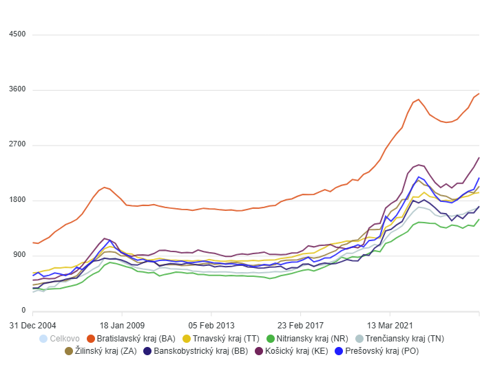 Rast cien nehnuteľností podľa krajov. Zdroj: nbs.sk
