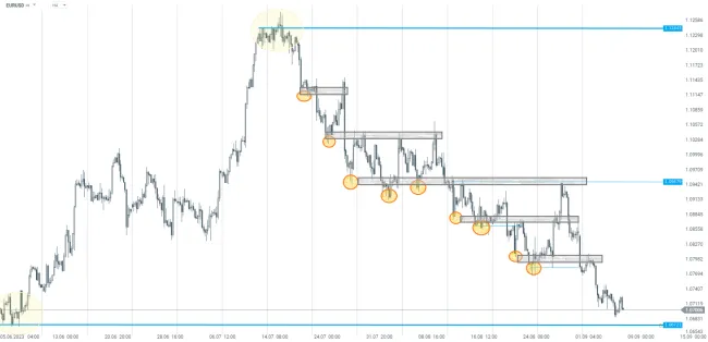 Tento prístup začína pohľadom na celkový obraz trhu – ide predovšetkým o fundamentálne riziká, ktoré by mohli vstúpiť do technického obchodovania, ale aj o sentiment medzi obchodníkmi. Pokiaľ tu nenarazíme na žiadne riziká, môžeme pokračovať v identifikácii hlavných trendov na trhu. Ideálnou voľbou môžu byť časové rámce W1 (týždenné) alebo D1 (denné), ktoré nám pomôžu nájsť kľúčové úrovne.