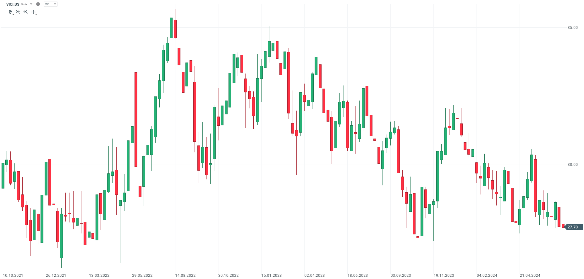 Zhoršený sentiment v realitnom sektore tlačí na akcie VICI, ktoré sa prepadli od začiatku roka o necelých 15 %. Ukazovateľ ceny k prostriedkom z prevádzky (P/FFO), ktorý je v realitnom sektore ekvivalentom P/E, sa v prípade VICI pohybuje pod svojim dlhodobým priemerom okolo 10,5.