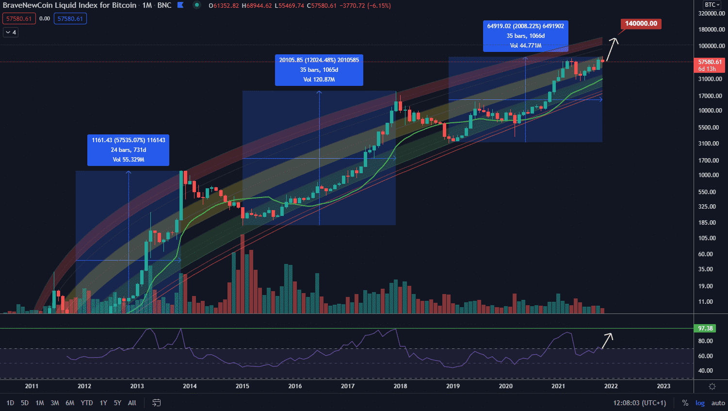 Na grafe nižšie môžeme vidieť súčasnú dĺžku rastúceho trendu v porovnaní s predchádzajúcim cyklom. Ako vidíme, súčasná dĺžka rastúceho cyklu je približne rovnaká ako tá predchádzajúca. Všetci na kryptomenovom trhu sa však zhodujú na fakte, že rastúci trend nie je na konci a bude ešte pokračovať, čomu nasvedčujú aj mnohé analýzy.