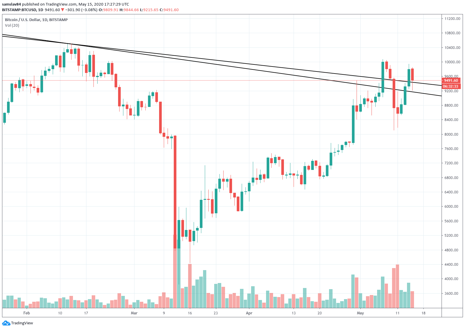 Bitcoin sa aktuálne obchoduje za cca 9500 $ a pasuje sa s dlhodobou klesajúcou trendovou líniou, ktorá nás v posledných troch rokoch obmedzovala v raste. S touto rezistenciou bojuje už tretí týždeň a očakávame, že o mesiac by už malo byť rozhodnuté.