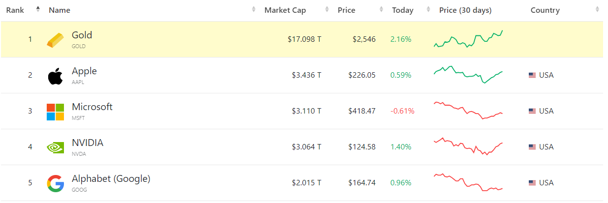 Zlato je podľa údajov CompaniesMarketCap najhodnotnejšie aktívum na svete s odhadovanou trhovou kapitalizáciou 17,09 bilióna dolárov.