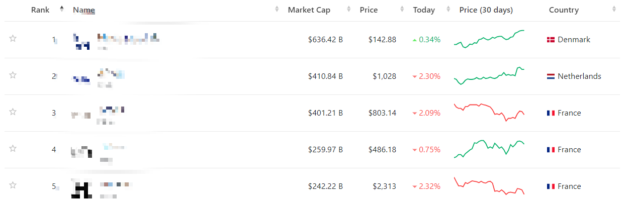 Len 5 najväčších firiem v Európskej únii (EÚ) dosahuje trhovú kapitalizáciu približne 2 bilióny dolárov. Ide o spoločnosti, ktoré pôsobia v rôznych odvetviach. Až tri z nich pochádzajú z Francúzska, jedna z Dánska a jedna z Holandska. Predovšetkým ide o celosvetovo známe značky, ktoré s vysokou pravdepodobnosťou poznáte.