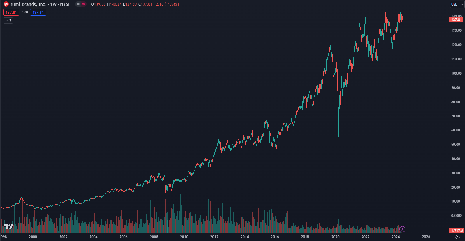 Akcie pod skratkou YUM zaznamenali za posledných 10 rokov zhodnotenie o 155 %. Za posledný rok nedošlo k výraznej zmene. Aj akcie YUM zaznamenali najväčší pád práve na počiatku pandémie; vtedy klesli za jediný mesiac o 50 %.