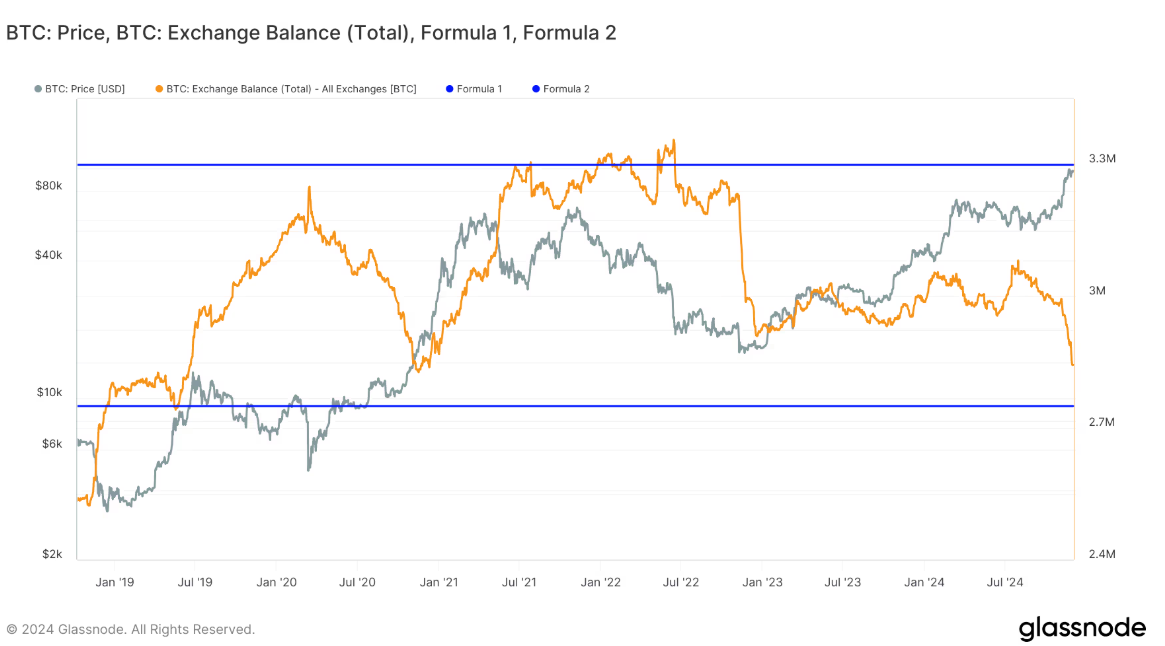 Od začiatku súčasného dynamického rastúceho trhu, ktorý sa rozbehol začiatkom novembra, Bitcoiny mimoriadne rýchlym tempom opúšťajú kryptomenové burzy, čo definitívne ukončilo takmer dvojročné obdobie relatívne stabilných burzových zostatkov. Pri detailnejšom pohľade na dlhšie päťročné časové obdobie však celkové zostatky na burzách stále zostávajú v relatívne úzkom pásme medzi 2,7 až 3,3 milióna tokenov.